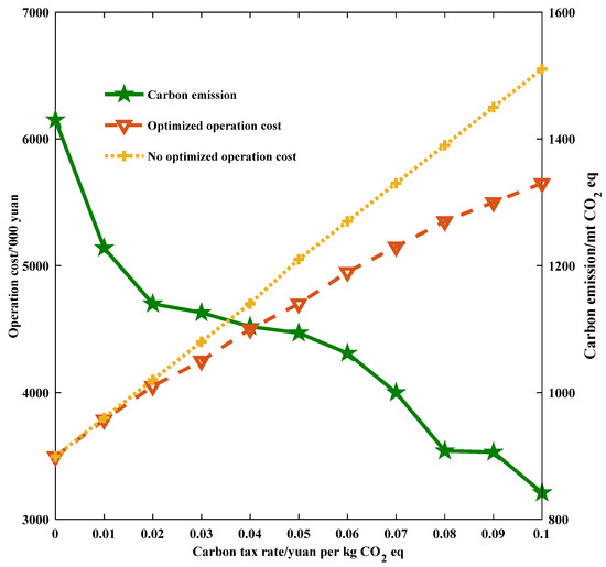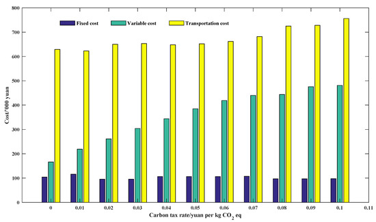 The values of part key parameters in the model are given according to the actual situation of the enterprise in Table 3 below, and the parameter values are all within a range. At the same time, the range of carbon tax rate is varying between 0.01 to 0.10 yuan/kg carbon dioxide equivalent according to the carbon tax range currently being studied by the Chinese government. The carbon tax rate in this study is also set in the range of 0.01 to 0.10 yuan/kg carbon dioxide equivalent. Optimization results are shown in Figure 3.