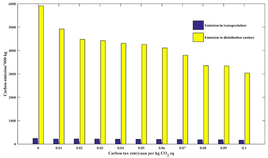 To achieve the sustainable development of the urban logistics sector, this paper studies the planning problem of an urban logistics distribution network consisting of logistics hubs, distribution centers, and sales terminals under the regulation of carbon tax policy. We studied the design and strategy changes of urban logistics distribution networks under the condition of a gradual increase in the carbon tax rate, which is of great significance for urban authorities to formulate carbon tax policy and the logistics industry to take active countermeasures. The main conclusions of this paper are as follows.