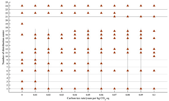 The binary variable , which represents whether the distribution center is selected, remains unchanged or changes slightly with the increasing carbon tax rate. It means that the logistics flow of the overall logistics distribution network also changes slightly to reduce carbon emissions and operating costs. For example, when the carbon tax is increased from 0 to 0.01 yuan/kg CO2, it can be seen in Figure 6 that only distribution center #19 is abandoned and replaced by distribution centers 12 and 15 simply.