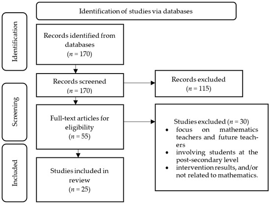 Critical peers were invited to take part in the screening and evaluation process to determine their eligibility for peer review. Two peer reviewers and I evaluated each title and abstract of the 170 citation records to filter them for relevant research using the following inclusion criteria: (1) concentrated on indigenous students; (2) reported interventions and results of interventions; (3) focused on kindergarten to high school students; (4) in the field of mathematics; (5) the article is a program evaluation or empirical research; and (6) the article has been published in academic journals/book chapter/proceeding and is empirical research or a program evaluation. Other than that, 115 studies were excluded after a review of the titles and abstracts. This includes interventions focusing on mathematics teachers and future teachers because this literature analysis focuses on interventions for Orang Asli students. In addition, some studies involved post-secondary students that did not provide results or practises and/or had nothing to do with mathematics. After that, the researcher looked for the remaining 55 studies’ full texts. Following that, the eligibility for final inclusion in the review was examined while reading the complete text of these 55 articles. Because they did not match the previously mentioned first-round inclusion criteria, a total of 30 articles were eliminated. Note that 25 articles were still available for inclusion in this systematic review after the finished full-text scan. With the help of the PRISMA Flow Diagram, Figure 1 explains the search and screening process.