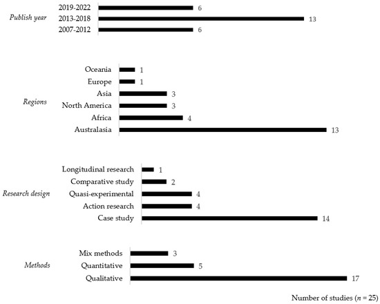 The 25 studies that have been included in this review were released in three book chapters (12%), one proceeding (4%) and 21 journals (84%). All of them were indexed in Scopus and Web of Science (WoS). Two studies (8%) were published in two publications focusing on broad indigenous and cultural perspectives (i.e., International Journal of Inclusive Education and Journal of Human Ecology). In journals with a general education focus, such as the Australian Journal of Education and the South African Journal of Education, five studies (21%) were published, Educational Studies, Education and Urban Society, and Creative Education), Moreover, seven research (or 28%) were published in journals with a concentration on mathematics education (i.e., Journal of Mathematics Teacher Education, Mathematics Education Research Journal, Canadian Journal of Science, Mathematics and Technology Education, International Journal of Science and Mathematics Education, and Journal for Research in Mathematics Education). Journals that only published one study included ZDM, Social Psychology of Education, Australian Journal of Early Childhood, Mediterranean Journal of Social Sciences, Journal of Interdisciplinary Mathematics, International Journal of Instruction, and International Journal of Learning, Teaching and Educational Research. Three chapters in the book Pedagogies to Enhance Learning for Indigenous Students: Evidence-based Practice, published by Springer, and one piece in the Proceedings of the 31st Conference of the International Group for the Psychology of Mathematics Education. Six (24%) of the studies in the sampled reviews that were published over the course of the 15-year search period did so between 2007 and 2012, 13 (52%) between 2013 and 2018, and six (24%) within the last four years. Australasia had the highest geographic representation, with 13 (52%) of the interventions taking place in Australia. With three studies in South Africa (12%), and one in Zimbabwe (4%), the continent was also significantly represented in the sample. Three studies—two in the United States (8%) and one in Canada (4%)—were carried out in North America. The third and fourth studies discussed programs in Europe (one research, 4%), Oceania (three studies, 12%), and Asia (three studies, 12%). In total, 17 (68%) of the 25 papers that made up this review were classified as focusing on qualitative data; these studies mainly used observation and interviews to gather qualitative information about the experiences of indigenous students. The other five studies (20%) adopted a quantitative methodology. The primary sources of quantitative data in these investigations were survey and test findings. A mixed methods technique was employed in three studies (12%) to generate both qualitative and quantitative data. In terms of research design, 14 studies (or 56%) were created as case studies that detailed the conception, implementation, and results of interventions, four studies (16%) used an action research methodology, four studies (16%) used a quasi-experimental methodology to compare student performance in the experimental and control groups, and two studies (8%) used comparative analysis. One study (4%) used a longitudinal research strategy. For a list of research characteristics, see Figure 2.