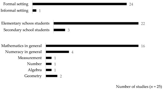 Only one study (4%) of the 25 studies included in the review reported interventions that took place outside of official educational settings and during school hours (e.g., community centres and outdoor settings). For a list of the features of the program, see Figure 3. Each intervention’s patterns of characteristics varied, for example, whether indigenous knowledge holders participated in its implementation, what mathematics concept was involved in the intervention and how long the intervention took place. Even though most interventions occurred in formal settings, the majority involved members of several groups in the implementation of the intervention, including staff from relevant institutions, researchers in education, indigenous knowledge holders, and/or researchers in education. Note that the age range of the participants in these official programs was four to fourteen years old. The youngest samples were 4-year-old students who were exposed to activity-based learning that encouraged them to take part in a context for learning and teaching that was play-based and focused on that age group [23]. In the unstructured context of the study, the intervention took the shape of a 4-day summer camp with planned community and lab activities centred on college access and achievement. Other than that, 14 indigenous high school students participated in this camp, interacting with indigenous people from diverse indigenous communities and sectors [24]. Out of 25 reviewed articles, only three studies (12%) involved secondary school students, while 22 studies (88%) were conducted in elementary schools. Here, mathematics concepts can be divided into six fields (i.e., algebra, geometry, number, measurement, mathematics in general, and numeracy in general). Four studies (16%) involved the topic of numeracy in general, two studies (8%) involved the topic of geometry, and one study (4%) each involved the topic of algebra, numbers and measurement. On the other hand, 16 (64%) studies involved mathematics in general.