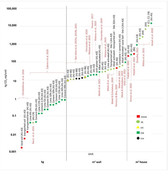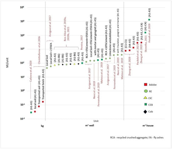 | Zhang et al., 2020 | [43] | Adobe | China | to compare the environmental impact with conventional assemblies | cradle-to-grave | A1–C4 | m2 house | literature (government data and scientific publications since 1996) | CED | undeclared | |