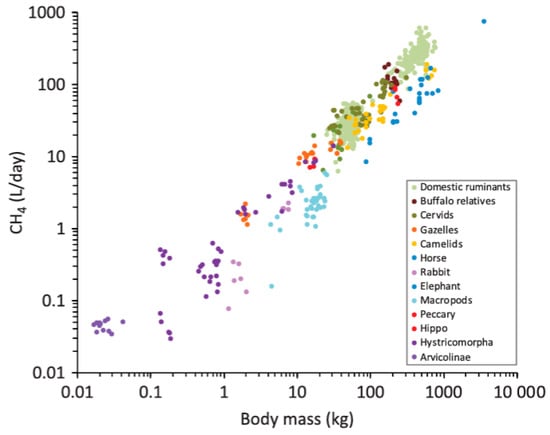 Correlation between body mass (BM) and (a) absolute daily CH4 emissions for different mammalian herbivores. Reproduced with permission from ref. [101].