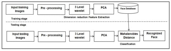 Facial recognition is used in many fields, such as human–computer interactions and artificial intelligence [44]. For example, facial recognition is used in online or distance learning with login systems and verification that the account is a real person and not a fake. As seen in Figure 1, the stages performed in the facial recognition process are described in most sections by relying on the use of 3WPCA-MD (Three-Level Wavelet Decomposition Principal Component Analysis with Mahalanobis Distance). This technique captures the extraction features of the PCAs, including three levels of the wavelet decomposition.