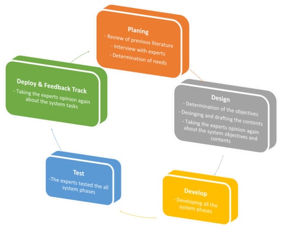 In this section, the general methodology used to develop this system with all its tasks is explained, in addition to adopting the Agile methodology [66]. Firstly, to begin to analyze the system requirements, the opinions of lecturers and experts were taken to identify the problems and challenges that they face in distance learning. Secondly, the contents were designed and drafted, and the experts’ opinions were taken again about the system objectives and contents. Thirdly, development occurred in several stages, and the designers returned at each stage to take opinions and comments to improve the development and design of the system. Fourthly, after the design and development of the system was completed, the experts tested all system phases. Finally, the system deployment and feedback tracking phase involved taking the experts’ opinions again about the system tasks. A semi-structured interview [67] was conducted with lecturers and experts to verify their satisfaction with and need for this system and to reveal the effectiveness and accuracy of this system. This section also discusses how to collect data, algorithms, and tools used to identify the student’s face and feelings and then to detect cheating on an e-test. It is worth noting that the Agile methodology was adopted because it is characterized by its ease of change and easy modifications. It also saves time and effort by not requiring developers to completely rework any changes [68].