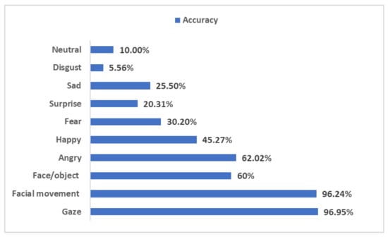 Discovering emotions by relying on facial expressions is considered an act of human nature. It is the most intuitive way to detect human emotions on the face. The term “facial expression recognition” has been developed [23]. Sown used automatic analysis to detect facial expressions by following the motion spots in an image sequence. In that experiment, a correlation between all the expressed and experienced emotions was demonstrated [24]. Discovering modern techniques where machines become capable of understanding the expression of gestures and putting them into the context of feelings must be the key to communication with humans. Thus, several approaches to detecting emotions from the face were adopted. Such approaches tackle the main groups of emotions by relying on very simple static models that have successful results [25]. Other ways to successfully categorize information from facial expressions include relying on explicit code systems that resemble the dynamics in which facial movements are coded in a group of action units (AUs) with a muscular basis called the Facial Action Coding System (FACS) [26]. Many researchers have considered the dynamics of changing faces, since the automatic captures are covered by action units from facial motion sequences [27].