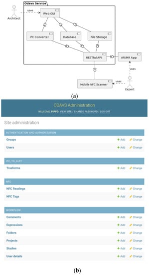 Concerning the Web GUI structure depicted in Figure 2b, it provides a Web user interface organized as a set of entity types, each containing pieces of information called entities supporting the aforementioned workflow. For each entity, four basic operations are possible through the Web GUI: adding a new entity, changing or deleting an existing entity and listing all or some of the entities of any given entity type. For each entity type, the links to the “Add” and “Change” operations are made available. Looking at the Web GUI from top to bottom, in the “Authentication and Authorization” section the entity types named Groups and Users are included. They allow the administrator to control the list of users with access to any entity type of the platform. They can limit the list of operations for a specific user or set of users. Through such entities, the platform implements a standard role-based access model for authorization, while authentication is based on standard password verification for each user. In the “IFC_TO_GLTF” section of the Web GUI, the entity type named “Transforms” keeps track of each request a user may have made to transform an IFC file into a GLTF one. In the “NFC section”, the entity type “NFC Tags” keeps track of all the serial codes of the RFID deployed in the buildings where ODAVS is going to be used, while the entity type “NFC readings” stores the relevant information of each RFID scan operation completed using the Mobile NFC scanner. In the “Workflow” section it is possible to find the core entity types of the ODAVS workflow. In particular, in “User Details” the administrator can associate a regular User with extra information concerning the usage of ODAVS, e.g., what projects are available to a given user. By means of entity types “Folders and Expressions”, the administrator can customize the list of IFC Object Types that can be shown or hidden through the interface of the MR App (e.g., furniture, systems, envelope). The entity type “Project” stores relevant metadata for each renovation project worked out within ODAVS, while the entity type “Study” stores further metadata for each candidate study to be assessed using ODAVS as well as their IFC attachments and can link them with the GLTF and JSON files generated using the “Transform” entity type. Finally, the “Comment” entity type contains the collection of annotations and comments uploaded by the user during the on-site survey through the MR App.