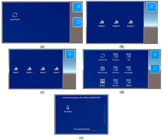The assessment task starts as soon as an expert is on site and establishes Internet connectivity. Then, he/she puts on the MR headset, logs into the device and runs the app. At this time, a virtual menu (Figure 3a) appears in front of the user allowing them to retrieve the available projects and renovation studies that can be assessed on-site. The user is then able to switch across different alternative options by selecting the desired project (Figure 3b) and, within it, the desired study (Figure 3c). After the selection of the study, the MR app queries the RESTful API for the related information (GLTF and JSON files). Once the download has been completed, the “Assessment menu” pops up (Figure 3d) for managing the loaded model that is not yet displayed on the MR app. This menu is made of several virtual buttons that allow the user to manage the model, to align it via RFID tags and to hide/show specific IFC categories of objects, which are outlined in Table 1.