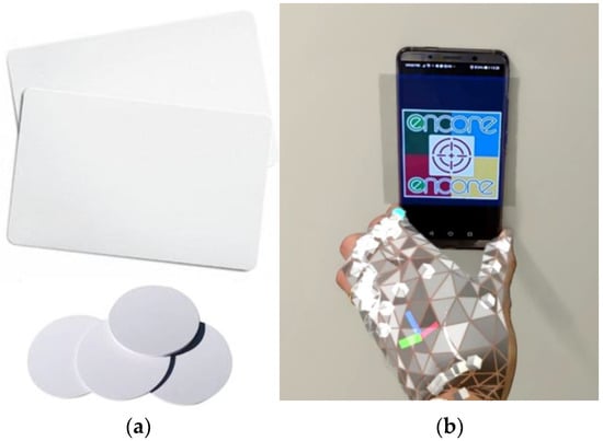 Picture of sample NFC tags (a) and first-person view of the expert while reading a tag (b).