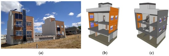 Demonstrator building in Caceres (a); partial 3D views of the first (b) and second (c) renovation design.
