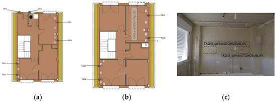 Plan view with the locations at which the tags were placed on the ground (a) and first (b) floors and pictures of two tags installed on the first floor (c).