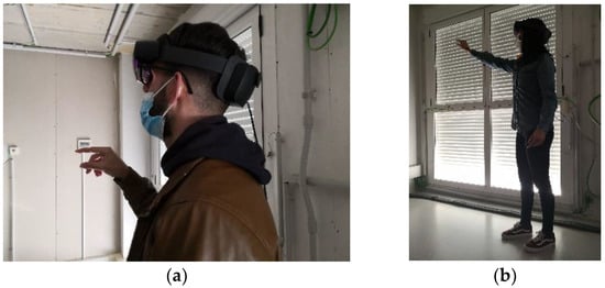 The eight volunteers chosen for the experiment attempted to perform the assessment of two renovation projects in two consecutive days. This allowed us to make a comparison of the performances between the two days, too. These tasks were carried out in a realistic environment provided by JEA. JEA owns two demonstrator housings, called “pattern housing” and “experimental housing”; in this case the latter was used to test the technology. The validation concerned two renovation options suitable for the experimental housing where the tests took place. Prior to the execution of tests, the eight volunteers were involved in a training session that was managed by one researcher from JEA and two researchers from the Polytechnic University of Marche, all skilled in the procedures and technology to be tested. The training session left the volunteers free to become familiar with the technology. As a result, during the tests they could use the MR App with no interference from the expert operators and a frank account could be recorded on the perceived usefulness and perceived ease-of-use of the technology, without being affected by any bias or other external variables. Finally, at the end of each day, each participant was asked to answer a questionnaire about the technology experience. The questions are listed in Table 2 and Table 3, while demographics and answers to open-ended questions are included in Table 4 and Table 5, and they will be discussed extensively in Section 4. The experimental facilities managed by JEA and built with construction features, surfaces and materials typical of the social housings of Extremadura are depicted in Figure 5a.