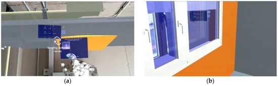 Then, every volunteer was asked to perform the assessment of the first renovation option on their own. During this task they were not helped by experts. Each person was encouraged to visit the whole ground floor of the building, to navigate the virtual model and to record at least one audio comment about at least one of the components affected by the renovation option under assessment (Figure 7a,b). This task took about 2 h and 30 min to be accomplished by all the volunteers, who were able to record and upload twenty-one comments using the MR Application. Eighteen out of the twenty-one comments were valid. The remaining ones were either empty or too noisy to be understood. This means that more than 85% of the audio files were recorded correctly. Figure 8a depicts a screenshot of the first-person view of one of the volunteers while using the MR Application to record a comment concerning the position of air inlets. In this case, a portion of the ceiling had been hidden by the volunteer in order to display the path of ducts to be installed in the ceiling. Prior to recording the comment, the user had selected the component interested by that assessment. Thanks to this action, every comment saved in the ODAVS platform was kept linked with the component it was referred to. Finally, every volunteer filled in questionnaire no. 1 (ref. Table 2).