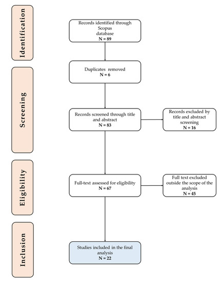 The query identified 89 articles, of which 6 duplicate articles were removed. In the screening phase, each article is analyzed in the title, abstract, and keyword to evaluate if its research is coherent to the goal of the review. In this stage 16 records were excluded since their focus was not on a resilience perspective. A total of 67 articles passed through the eligibility phase. Of this, 45 papers were removed after the research team read the full texts and determined that they did not match the requirements for inclusion. These articles did not offer insights on the meat industry and were considered outside the scope of the analysis.