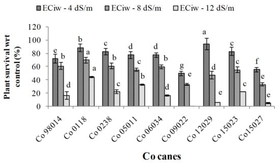 It is difficult for terrestrial plants to grow well in salty environments. High amounts of sodium and chloride ions are toxic if they accumulate in the cytoplasm of plant cells, which is made more difficult by the high osmotic pressure around the roots that might reduce the survivability percent. Additionally, energy that may be employed for growth is spent for the ion transport required for minimising toxicity and maintaining ion homeostasis under salinity. Our results also showed that higher EC during formative phase significantly affected the plant survivability and cane length in all the studied genotypes and this might be due to restricted water and nutrient availability or associated with alterations in gas exchange attributes [22]. Literature also reported that salt water of >8 dS m−1 caused significant reduction in growth, physiological traits and hampered yield by 50% [8,9].