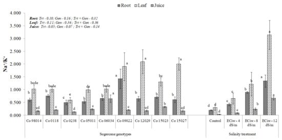 Na+/K+ dynamics in root, leaves and juice under salinity stress in genotypes. [Different alphabets denote they are significantly different compared to others].