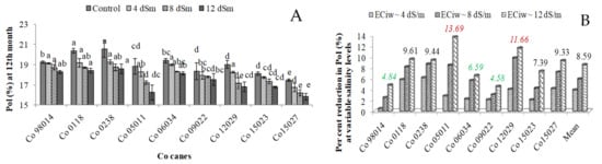 Generally, salinity stress disturbs the water and nutritional balance, decreased source to sink ratio and reduced photosynthetic source size such as leaf area and shoot length of plant, which ultimately affected the ability of the crops to assimilate and utilize the resources that culminate in the final yield [19,24,44]. Present results also revealed that continued saline irrigation of ECiw ~ 4, 8 and 12 dS m−1, respectively, led to 36.4, 68.5 and 83.5% mean reduction in SCW in comparison to control (Table 4). These results suggested that continued irrigation of ECiw ~ 12 dS m−1 was not appropriate for sugarcane production. Continued saline water irrigation disturbed turgor balance, impaired photosynthetic machinery, reduced source-sink ratio, imbalanced nutrient content due to higher accumulation of toxic ions and disturbed enzyme activities especially sucrose and starch synthase which might be the possible reason for such reductions in cane weight of genotypes [19,22].