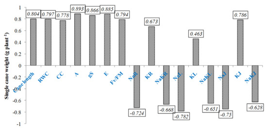 Correlation was drawn to analyze the association of different traits with cane weight under saline environment and found that all traits showed significant positive correlation with cane weight except Na+ and Na+/K+ in different plant parts (Figure 5). Highest significant positive correlation was noted with gas exchange traits that have significant role in contributing yield.