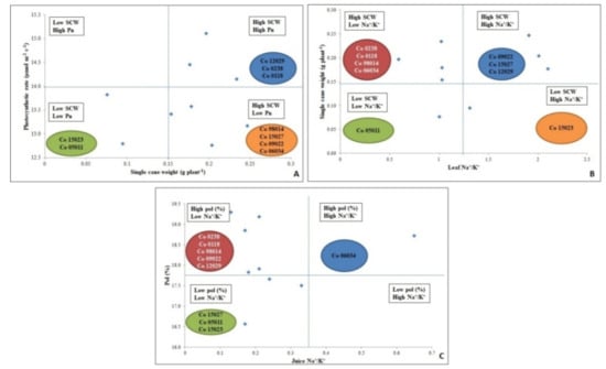 Association among different traits to identify salt tolerance in different genotypes; (A) Pn vs. SCW; (B) SCW vs. Leaf Na+/K+ and (C) Pol(%) vs. Juice Na+/K+.
