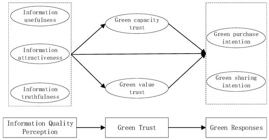 The strength of arguments in green advertising messages is an important factor in consumer judgment, with green ad with strong arguments being the most effective [36]. Some studies have found that consumers prefer high-quality brand messages because they reflect higher reliability and provide more positive signals [37]. For example, Shoenberger et al. [38] and Pittman et al. [39], found that consumers’ perceived authenticity of brand messages is key to promoting advertising success, i.e., message authenticity promotes a persuasive mechanism for consumers to generate green ad purchase intent. Zhu et al. [40] argued that social media advertising message appeal possesses the advertising that influences consumers’ brand purchase intent Hussain et al. [41] found that the entertainment, attractiveness, interactivity, and topicality, of social media ads can influence online brands’ purchase intention and word-of-mouth propagation intention. In the context of green advertising, perceived information quality measures the strength of usefulness, attractiveness, and authenticity, of the information consumers receive from green ads, and consumers who receive more useful, engaging, and authentic information, from green ads will have a relatively lower decision risk to respond behaviorally based on their enhanced brand perceptions, which in turn tend to be more likely to respond in terms of purchase intentions and brand communication [20] to respond positively to green brands. Accordingly, this paper hypothesizes that:
