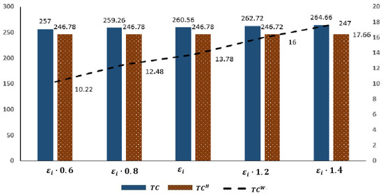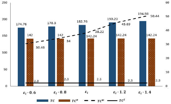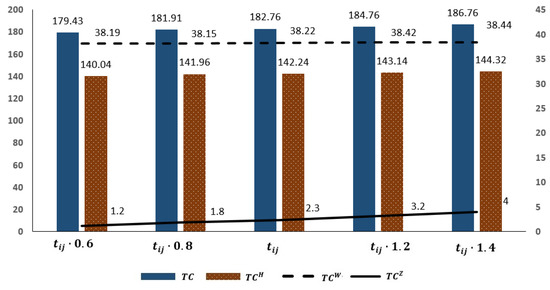 An increase in means an increase in the sum of empty container transportation and handling time between ports. It can be seen from Figure 6 that in the repositioning strategy, the port storage cost and lease cost change less, and the reposition fee will increase significantly. Because the increase in transportation and handling time will lead to an increase in repositioning costs, ports can only meet market demand by increasing the storage or leasing of empty containers, which in turn leads to increased storage costs and leasing costs. Since port operations in the non-repositioning strategy are not affected by , port storage costs and leasing costs in the non-repositioning strategy will not change.