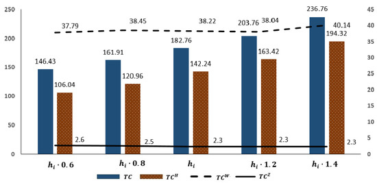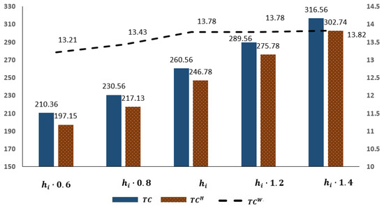 An increase in means an increase in the storage fees of empty container units. It can be seen from Figure 8 and Figure 9 that with an increase in , the port storage costs increase significantly under both the reposition and non-repositioning strategies. The total port costs mainly include the empty container storage cost, so the total cost also increases with the empty container storage cost increasing. Due to the increase in the storage cost of empty containers, the port has to increase or to meet the demand for empty containers, and the costs of empty container leasing and repositioning also increase slightly.