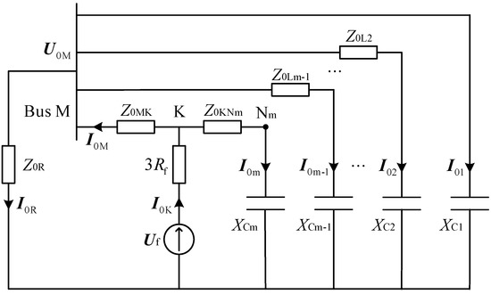 According to the principle of voltage division, the zero-sequence voltage U0K at the fault point and the zero-sequence voltage U0M of the system bus M can be obtained as follows: