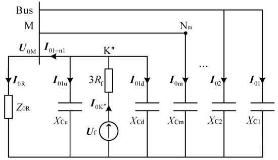 It can be seen from Equation (13) that although the fault location changes the circuit of the ground-to-ground capacitance in the zero-sequence equivalent network, the reactance of all capacitive branches in parallel is exactly the same as that the fault of collector line occurs, so the zero-sequence voltage U0K“ at the fault point is also exactly the same as the expression in Equation (12).