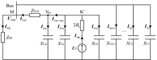 When the single phase (A phase) grounding fault occurs at K’ point on the collector line m-nm in the IGPSm below the tie line MNm, the fault equivalent zero-sequence network is shown in Figure 4, and the impedance of the non-fault capacitive branch is ignored.