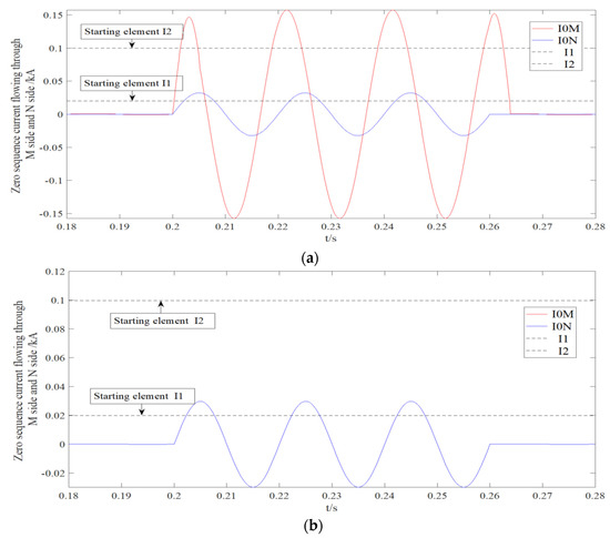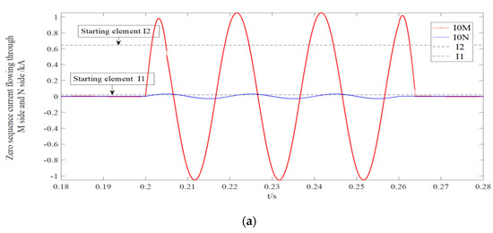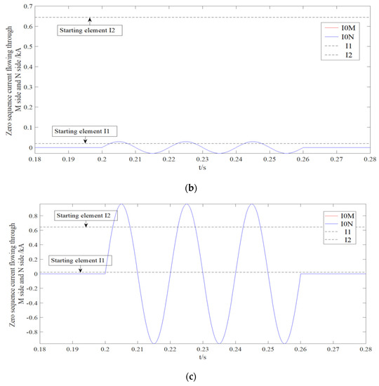 When single-phase ground fault occurs on three different lines in the collection system (Rg = 150 Ω), the zero-sequence current flowing through the collection bus M and N2 is shown in Figure 12.