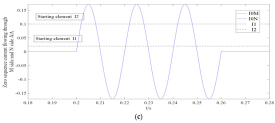 Figure 11a–c shows the zero-sequence current before and after fault on tie line MN2, collector line 1-5 and collector line 2-2, respectively. In order to observe and determine the action of starting element under different fault conditions, the threshold values of high constant value starting element I1 and low constant value starting element I2 are also added in the current diagram.