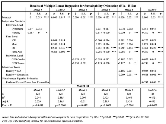 This analysis was implemented in a similar fashion to the models above, although the variables included were not identical. At the inter-firm level (Model 1) we looked at the impact of market dynamism, renewable portfolio standards (RPS), and the rurality of the state’s population to explain the variability in renewable power supply. At the firm level we tested the effects of utility ownership structure and entrepreneurial orientation on the percentage of power from renewables (Model 2). At the individual leadership level, we investigated the impact of the manager’s gender on the dependent variable (Model 3). Model 4 included variables at all three levels, and Model 5 included interaction effects. Model 6 is the simultaneous equation estimation, and the identifying variable is Renewable Portfolio Standards (RPS) (Figure 3).
