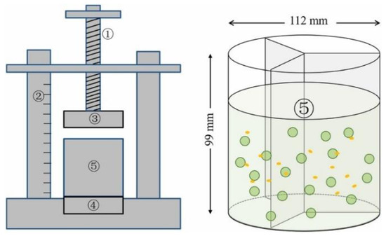 SMF stimulation device for the algal–bacterial consortium: 1—spiral adjustment rod, 2—scale plate, 3—movable magnetic pole, 4—permanent magnetic pole, 5—specially designed container. Source: [87].