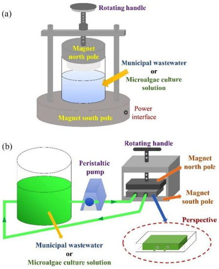 - Feng, X.; Chen, Y.; Lv, J.; Han, S.; Tu, R.; Zhou, X.; Jin, W.; Ren, N. Enhanced lipid production by Chlorella pyrenoidosa through magnetic field pretreatment of wastewater and treatment of microalgae-wastewater culture solution: Magnetic field treatment modes and conditions. Bioresour. Technol. 2020, 306, 123102. [Google Scholar] [CrossRef] [PubMed]
