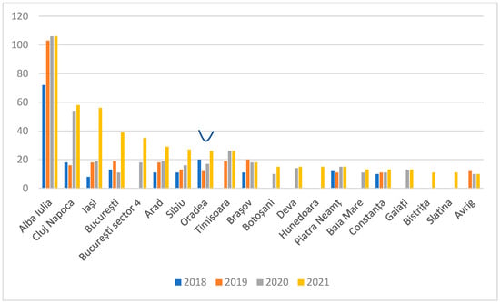 Romania’s top public administrations are headed by Oradea, the city with the highest administrative efficiency among the 320 cities in Romania … Oradea has the best capital expenditure performance, with an investment of 1,225 Euros per capita over the last eight years and with an attraction of European funds of 716 Euros per capita” (p. 3). It is of particular interest to note that in 2018, Oradea was situated in second place with 20 projects after Alba-Iulia smart city, with 76 projects [