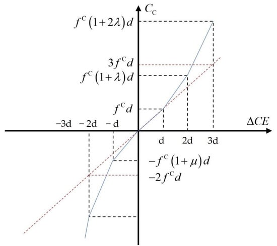 The carbon trading cost of a power system is related to the carbon trading volume of the system, which is generally based on the net emissions of the system, i.e., the difference between the carbon emissions of the system and the carbon emission allowances as the carbon trading amount of the system. After calculating the net carbon emissions, the traditional carbon trading model generally takes Equation (3) to calculate the carbon trading cost. It indicates that if the system’s carbon emissions are smaller than the carbon emission allowances in a certain time, the remaining credits can be sold to gain revenue; if the system carbon emissions are larger than the carbon emission allowance, it needs to pay extra to buy the allowance.