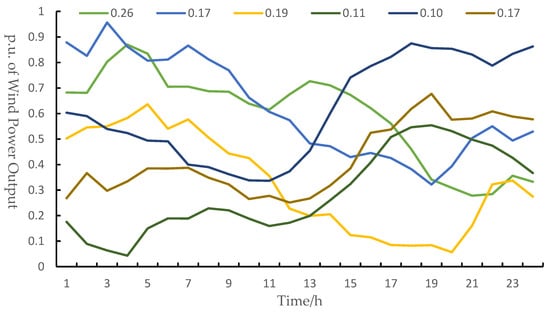 Since wind power output is characterized by randomness and uncertainty, it is impossible to analyze and evaluate every wind power output scenario in the analysis process, and cluster analysis, as an effective tool for cutting scenarios, can solve this problem well. In this paper, the K-means clustering algorithm is used to cluster the wind power output scenarios. Based on the one-year wind power generation data of a wind farm in western China, the number of target clusters is set to six, and the six typical clustering output curves and the corresponding scenario probabilities are shown in Figure 4.