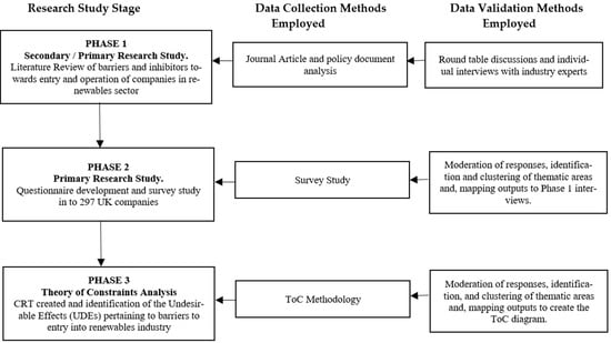 The research supporting this paper was split into three distinct phases [40]. Figure 1 shows a diagram of the overall research methodology. Phase 1 research resulted in the identification of a series of risks and barriers affecting the development of renewable supply chains. This information was obtained through three stage approach consisting of a comprehensive literature review, focus groups and individual interviews with industry experts. Phase two involved a survey of companies in order to explore and identify any further risks and barriers and also to understand the ways in which the companies recognized these risks and barriers as potential issues in order of importance to the companies. Phase three of the research built on the data gathered from phase one and two by applying the theory of constraints (ToC) methodology in order to characterize how the barriers and enablers impact a company’s motivations to invest its assets and enter the renewables supply-chain sector. In particular, one of the key aspects of the ToC approach was adopted: constructing a current reality tree (CRT) diagram. This diagram is useful to illustrate the interconnectedness of the risks and barriers within the renewable supply-chain system and to identify the key UDEs from which it is possible to provide solutions to remove these UDEs. This phase is the main element for the analysis being presented in this paper.