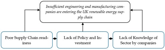 The authors then assembled a team of experts made up of academics with specific knowledge and expertise in renewable supply chains and supply chains in general, CEOs of engineering and manufacturing companies who work within and outside the renewables sector, government support agencies that focus on innovation and manufacturing support to the industry and sector skills councils from the renewables sector. Alongside the information gained from the research phases of study, the team’s joint expertise was used to add to the existing research knowledge base. The team members came to a consensus over the identification of the three key constraints of the system. The key constraints are seen as the three major issues that are deemed to cause problems for engineering and manufacturing companies to enter the renewables supply chain. From these three constraints, it was then possible to add further causes and effects that eventually connect the constraints together to create the CRT. These key constraints were: