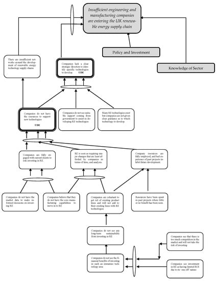 Therefore, at the first level of the CRT, Figure 2 shows that when there is a combination of; poor supply-chain readiness along with a lack of suitable policies and government investment in renewables infrastructure and a lack of knowledge of the sector by engineering and manufacturing companies, this leads to the key problem, in that insufficient engineering and manufacturing companies are entering the UK renewable-energy supply chain. From here, the CRT is then developed by working downwards to attach causes to each of the main constraints. In doing so, a CRT for each constraint is developed that shows the cause and effect relationships that cause the constraint to occur.