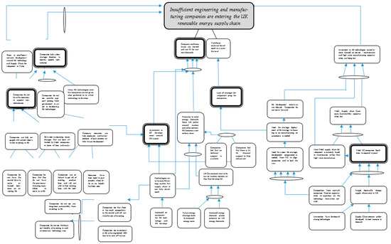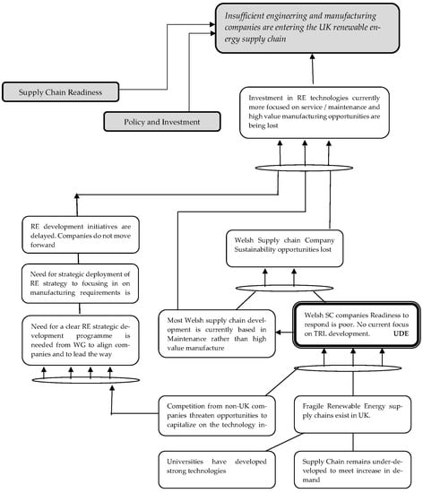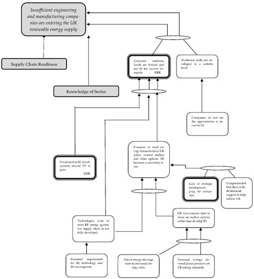 ToC identifies the potential bottlenecks (constraints) to the performance of a system and/or process [17]. These constraints are identified through initially identifying undesirable effects (UDEs). These UDEs are effects that inhibit a system’s performance and, in the context of this study, UDEs would be the perceived barriers and risks companies see as preventing them entering the renewables supply chain [29]. Although, traditionally, the ToC approach has been applied to single organizations as a primarily operations management technique, there is evidence of ToC being applied within the supply-chain perspective [30] and the understanding of a system from ToC analysis [7].