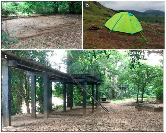 Both shelter camping and glamping/luxury camping are practiced in Sri Lanka’s natural areas. However, only shelter camping is predominantly allowed inside NPs and therefore, shelter campers were the focal group of this study. The campsites in Sri Lanka’s NPs can be categorized as ‘developed’ and ‘undeveloped’, based on the type of development and infrastructure facilities available at campsites [15]. Undeveloped campsites are those with basic facilities, including an area devoid of vegetation purposefully cleared by park management, with a toilet provided. Some undeveloped campsites may include slightly elevated tent pads constructed with earth (Figure 1a). Developed campsites include specially constructed formal structures for camping, such as elevated camping platforms constructed on concrete beams or slightly elevated concrete/cement platforms constructed on the ground (Figure 1c), a toilet, a designated cooking area with table-like structures and seating made of cement and bricks. Typically shelter camping in the NPs of Sri Lanka involves activities such as campers setting up temporary tents on developed or undeveloped campsites (Figure 1b), cooking, and setting up a bonfire. Campsites are often located close to a water source. The maximum duration of occupancy of a campsite in Sri Lanka’s NPs is two nights and the allowed group size is ten persons [53].
