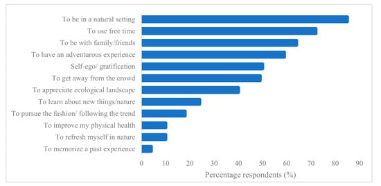 Respondent motives for engaging in camping in NPs of Sri Lanka varied widely. Based on the frequencies, ‘to be in a natural setting’ was the primary motivation for most visitors to visit a forest-based attraction. This was followed by ‘to use the free time’ and ‘to spend time with ‘family/friends’. Motivational items ‘to refresh myself in nature’ and ‘to memorize a past experience’ were the lowest ranked (Figure 2).