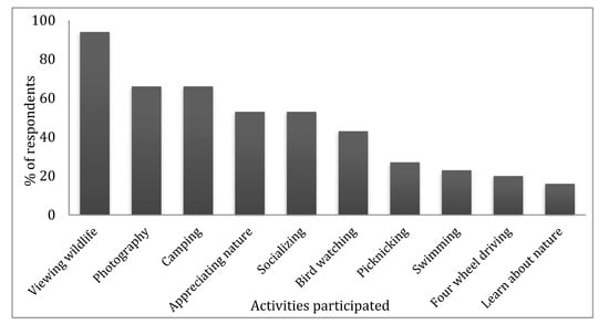 The purpose and activities engaged during camping also showed great variability. The most participated activities were viewing wildlife (94%), photography (66%), and camping (66%). ‘Learning about nature’ (16%) was the lowest-rated purpose/activity by respondents (Figure 3).