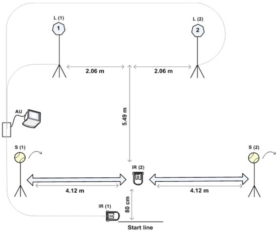 The preplanned agility (CODS) and reactive agility (RAG) tests were constructed in such a way that the examinees imitated specific movements in tennis (Figure 1). The examinees start from a predetermined starting line in both tests. At the moment when the infrared signal (IR1) located next to the starting line is interrupted by the “split step”, the time starts to be measured and one of the two lights (L1 or L2) lights up. The participant should recognize which light has turned on, run with an overstepping and lateral technique to the side to the stand with a ball placed on it (S1 or S2) and hit the aforementioned ball forehand or backhand in front of the body with enough force that the ball hits the ground. After playing the shot, the player should return as quickly as possible to the device in front of the starting line and interrupt the infrared signal (IR2) again, which ends the measurement. In the preplanned agility test (CODS), the subjects know in advance which light will turn on; that is, they can plan in advance to run and play forehand or backhand shots. Each test was performed nine times, and for further processing, the mean measured value of both tests was taken [14].