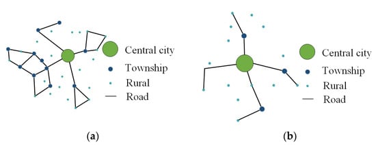Bus route network layout model for rural areas. (a) Ring network structure diagram; (b) tree structure diagram.