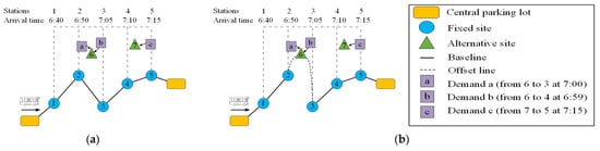 Layouts of transportation networks between urban and rural areas are mainly based on a ring and tree structure, as shown in Figure 1, usually the bus vehicle running along a fixed road, only able to pass through a small number of towns and villages, the vast majority of rural locations from the bus fixed away from the line farther. However, for most passenger demand from rural areas, passengers need to walk a long time to take the bus. At the same time, this increases the demand response transit operation cost and running time owing to longer urban and rural transportation lines and uneven distribution of demand points [36]. This also leads to a poor operational effect on bus enterprises and reduces passenger well-being. To address the abovementioned drawbacks, a variable-route demand response transit service model is proposed, as shown in Figure 2. After processing the reservation passenger information, fixed stations and alternative stations are established. The line connected by the fixed stations is called the base line, and the bus needs to respond to all fixed stations during operation, as shown in Figure 1a. For the base line outside the demand point a and b clustered into alternative sites 6 at 7:00 to respond, but the demand point c is rejected, as shown in Figure 1b. This is because the demand point 7, where the alternative station is located, has a low number of passengers, and shifting past it would produce significant waiting time and operating costs.