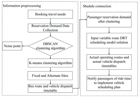 To reduce the operating cost and running time of demand responsive transit between urban and rural areas, a DBSCAN K-means (DK-means) clustering algorithm, which is based on the density-based spatial clustering of applications with noise (DBSCAN) and K-means clustering algorithm, was proposed to cluster pre-processing and station optimization for passenger reservation demand and to design a new variable-route demand responsive transit service system that can promote urban–rural integration. Firstly, after preprocessing the reservation demand through DBSCAN clustering algorithm, K-means clustering algorithm was used to divide fixed sites and alternative sites. Then, a bus scheduling model was established, and a genetic simulated annealing algorithm was proposed to solve the model. Finally, the feasibility of the model was validated in the northern area of Yongcheng City, Henan Province, China. The results show that the optimized bus scheduling reduced the operating cost and running time by 9.5% and 9.0%, respectively, compared with those of the regional flexible bus, and 4.5% and 5.1%, respectively, compared with those of the variable-route demand response transit after K-means clustering for passenger preprocessing.