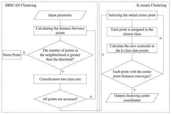 To filter and cluster all reservation requirements, this study proposed a DK-means clustering algorithm, which combines the DBSCAN clustering and K-means algorithms. This is because the conventional K-means algorithm has difficulty in handling non-spherical clusters, and the clustering results are influenced by extreme values [37]. In this study, the clustering reliability can be substantially improved by using the DBSCAN algorithm to pre-process the passenger reservation demand and divide them into clusterable and noisy points and by using the K-means algorithm to operate on the set of clusterable points to obtain fixed and alternative stations in each location. The steps of the DK-means algorithm are presented below, and the algorithm flow is shown in Figure 4.